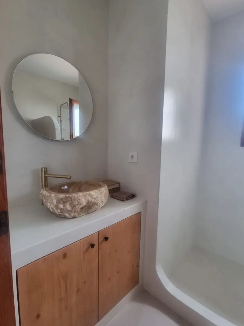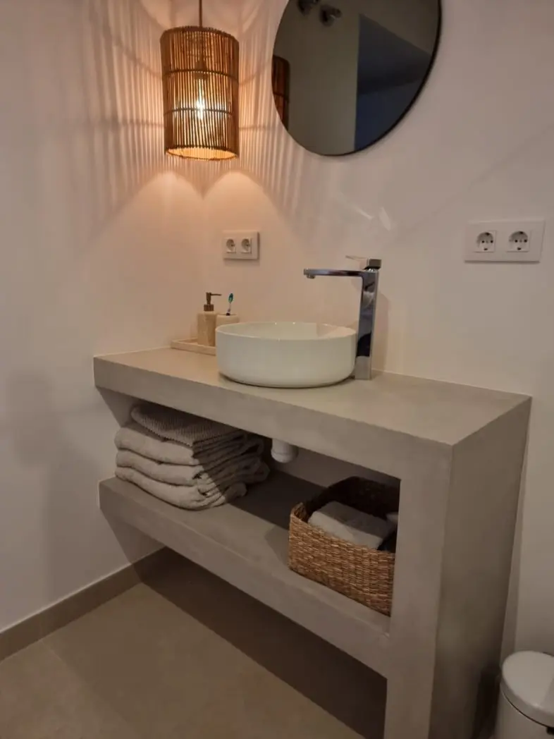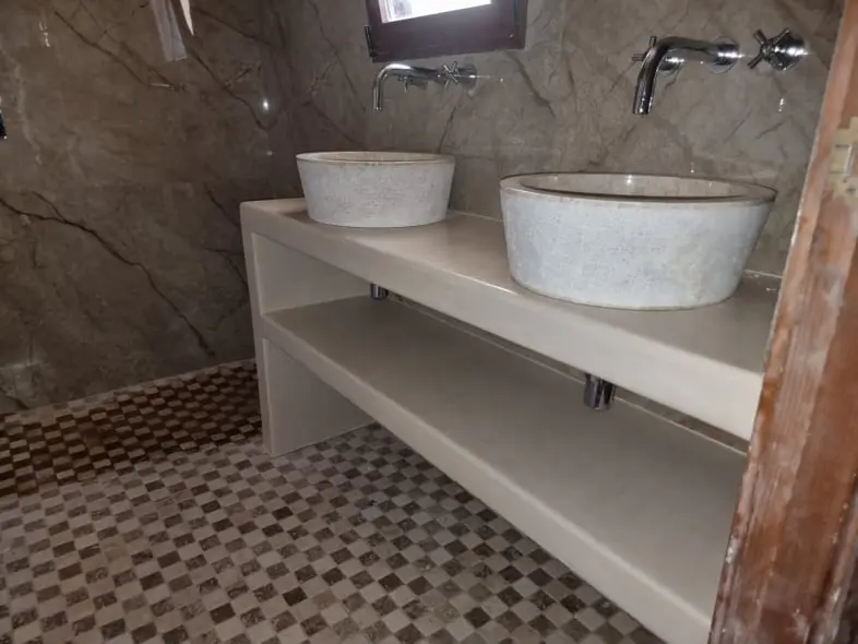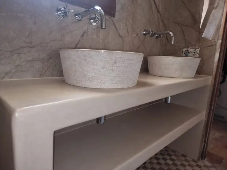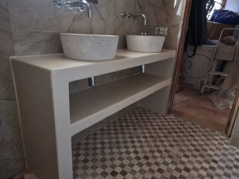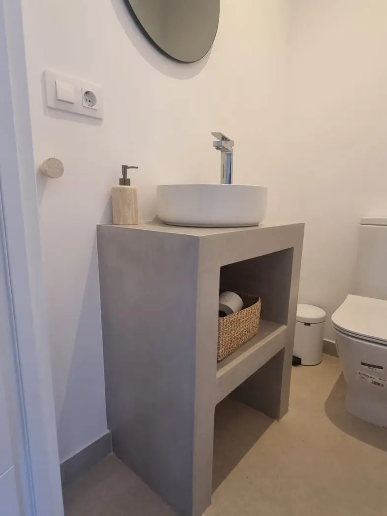 La aplicación de microcemento en muebles para lavamanos ofrece un acabado que transforma