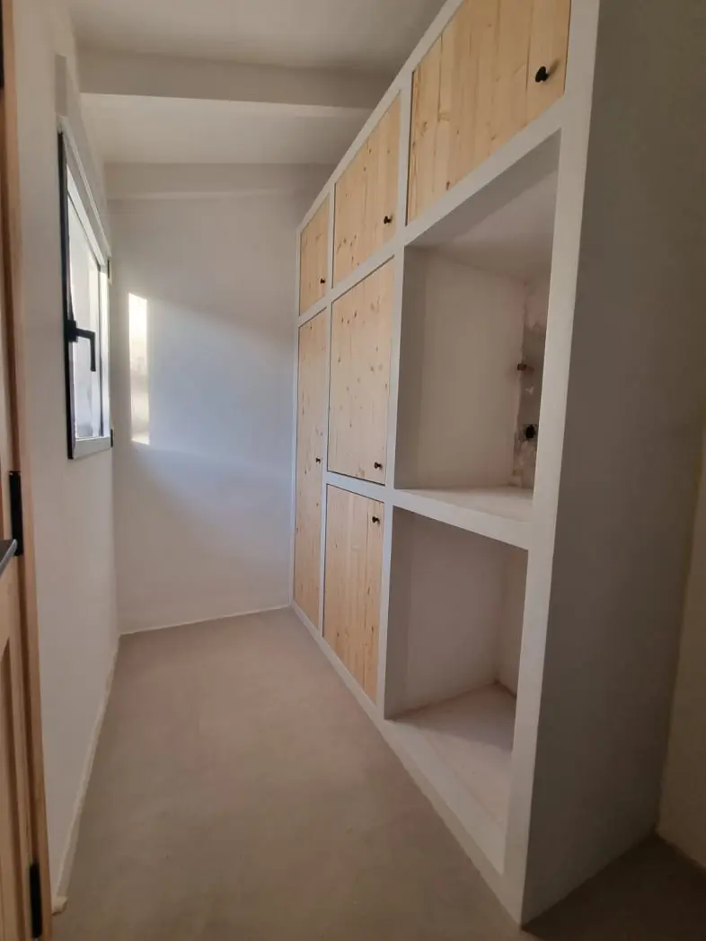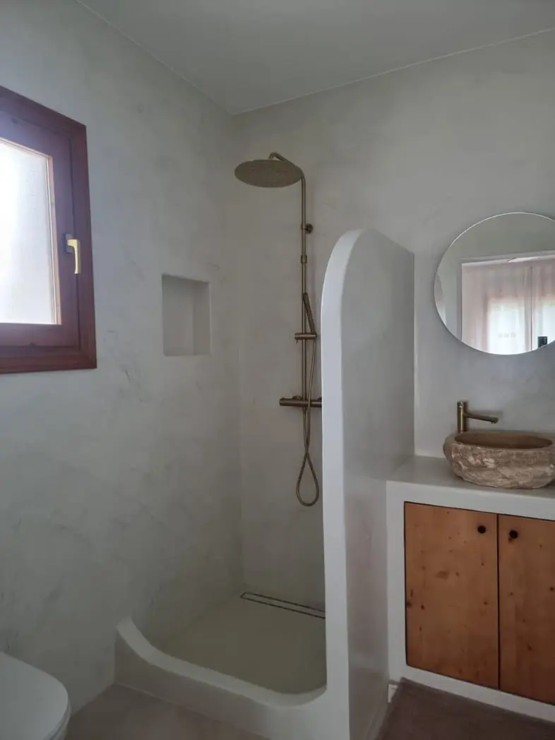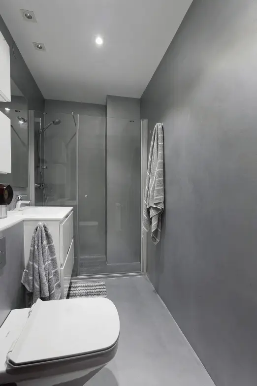 cubriendo paredes,, ducha y suelo con un acabado continuo. Su alta resistencia a la humedad y fácil