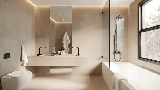 La aplicación de microcemento en un baño permite crear un espacio uniforme, moderno y sin juntas,